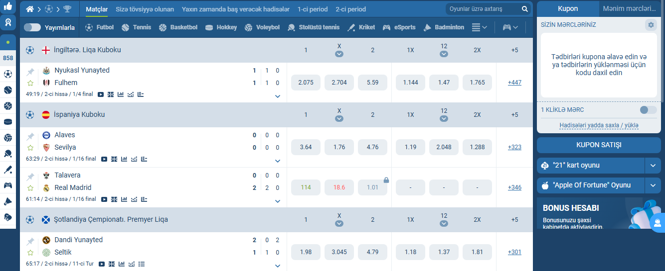Anlıq kupon yenilənməsi: Seçilmiş mərc bazarları və əmsallar avtomatik olaraq yenilənir. Əmsal dəyişdikdə kupon dərhal uyğunlaşdırılır və istifadəçidən səhifəni yeniləmək tələb olunmur.