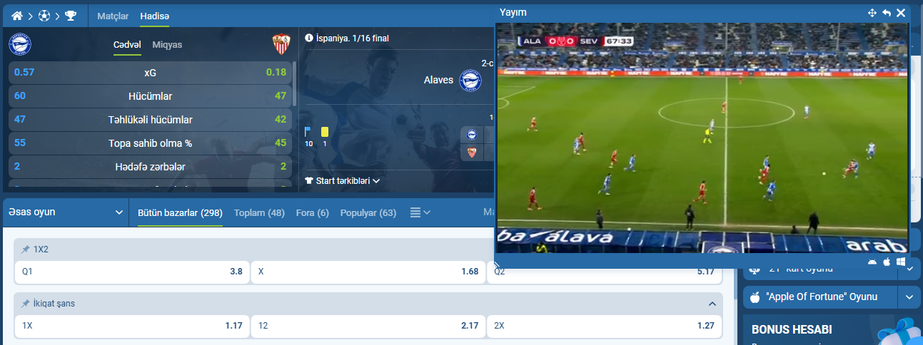 Eyni matç üçün birdən çox canlı mərc yerləşdirmək mümkündürmü?Bəli, eyni qarşılaşma üçün müxtəlif vaxtlarda bir neçə canlı mərc yerləşdirmək mümkündür. İstifadəçi oyunun fərqli mərhələlərində müxtəlif bazarlardan istifadə edə bilər. Hər mərc ayrıca kupon kimi qəbul olunur və nəticələr müstəqil şəkildə hesablanır. Məsələn, 15-ci dəqidədə “Komanda A”nın növbəti qoluna mərc edərkən, 70-ci dəqiqədə “Komanda B”nin növbəti qoluna mərc etmək olar.