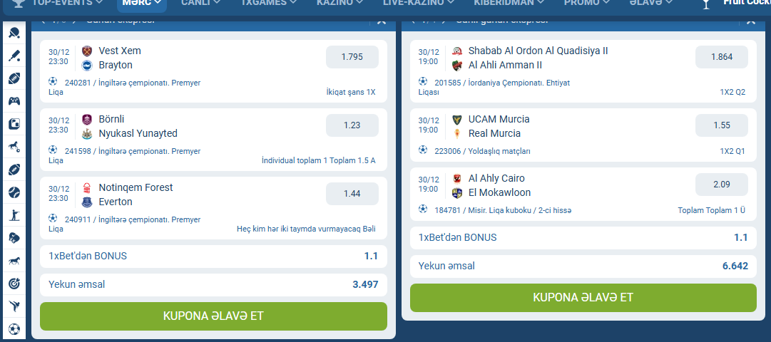 Bir kuponda neçə futbol qarşılaşması birləşdirmək olar?İstifadəçi istədiyi qədər futbol qarşılaşmasını bir kuponda birləşdirə bilər. Lakin matç sayı artdıqca ümumi əmsal yüksəlsə də, risk səviyyəsi də paralel şəkildə artır. Buna görə bir çox istifadəçi az sayda, daha analiz edilə bilən seçimlərlə kupon yaratmağa üstünlük verir. Yenə də seçim sizin şəxsi tərcihlərinizdən asılıdır.