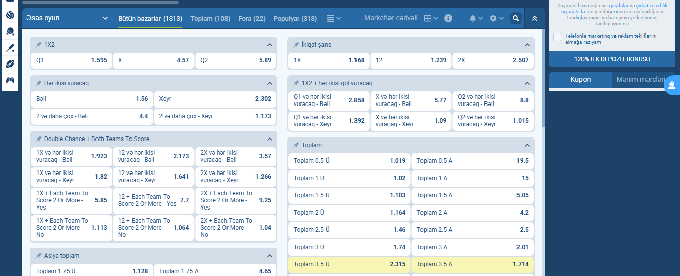 Toplam (Üst/Alt): Oyunda vurulacaq ümumi qol sayının müəyyən edilən saydan çox, yoxsa az olduğuna əsaslanan seçimlər.